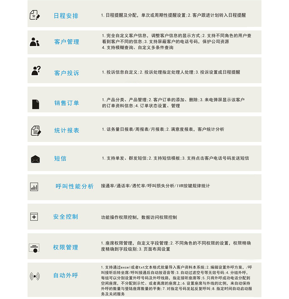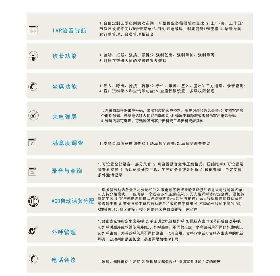 1. 具有來。去電彈屏. 鼠標(biāo)撥號(hào). 錄音. 客戶信息輸入. 分婁. 編組. 修改. 編輯. 導(dǎo)入導(dǎo)出