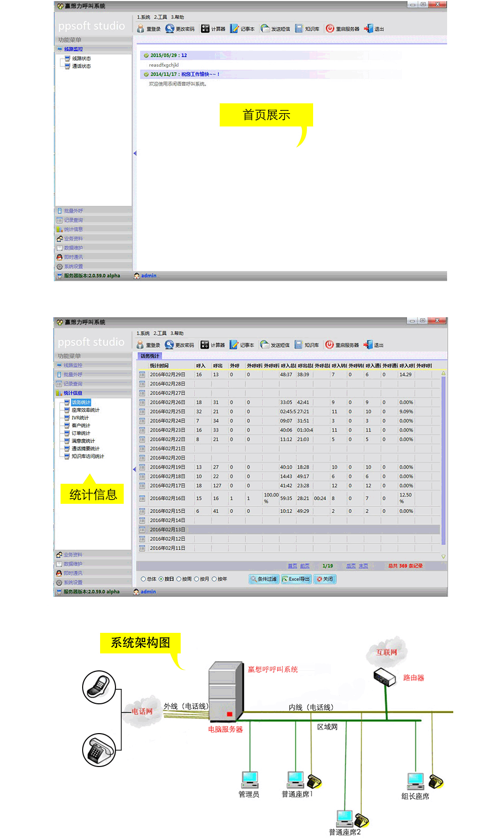 2. 強(qiáng)大的統(tǒng)計(jì)報(bào)表功能. 來. 去電次數(shù). 通話時(shí)長(zhǎng)可統(tǒng)計(jì)列表. 自動(dòng)群呼時(shí)還能對(duì)已購(gòu). 有意向. 猶豫、占線. 未接、接聽后是否按鍵回呼等狀態(tài)分別列表出來. 便于針對(duì)不同客戸的特點(diǎn)采用回訪. 跟進(jìn). 勸說等不同