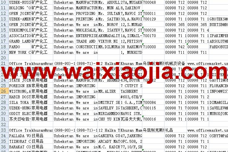 烏茲別克斯坦采購商名單數(shù)據(jù)為Excel格式,信息可任意修改、復制、打印、導出及導入到傳真、郵件群發(fā)等軟件中,無任何限制。