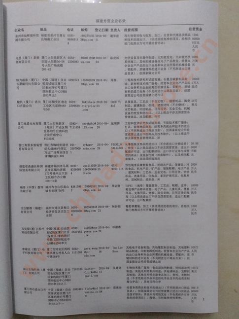 最新福建外資企業(yè)黃頁涵蓋了福建外商獨資企業(yè)、中外合資經(jīng)營企業(yè)以及港、澳、臺資企業(yè),包括福建日資臺資企業(yè)黃頁,福建外企黃頁具體內容包括:企業(yè)名稱、地址、電話、傳真、郵箱、經(jīng)營范圍、注冊資金等信息;福建外資企業(yè)名單里面的企業(yè)都一些中外合資的大企業(yè),這些公司經(jīng)濟實力都比較雄厚,出口產(chǎn)品也比較多,業(yè)務范圍都比較廣,跟他們開展業(yè)務往來都比較容易;有了福建日企臺企黃頁開展業(yè)務也有了針對性,也省去了盲目去尋找客戶名單而浪費的時間了,工作效率也會有很大的提高.歡迎需要的客戶及時聯(lián)系我們!