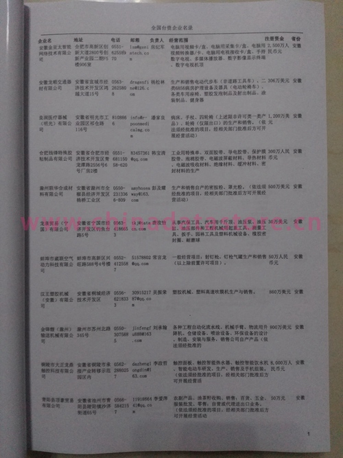 最新臺(tái)灣在大陸企業(yè)黃頁主要收錄了臺(tái)灣在大陸的獨(dú)資、合資、合作經(jīng)營等類型的企業(yè)通信黃頁,臺(tái)灣投資企業(yè)黃頁內(nèi)容有:企業(yè)名稱、地址、電話、傳真、電子郵箱、經(jīng)營范圍、注冊(cè)資金等;臺(tái)資企業(yè)黃頁都是一些國際上的知名品牌企業(yè)在大陸地區(qū)設(shè)立的分公司及辦事機(jī)構(gòu),這類企業(yè)經(jīng)濟(jì)實(shí)力、技術(shù)實(shí)力與品牌效應(yīng)都比較強(qiáng),與這類企業(yè)開展合作業(yè)務(wù)是許多國內(nèi)企業(yè)夢(mèng)寐以求的事情,因此在大陸臺(tái)資企業(yè)名單是各個(gè)國內(nèi)企業(yè)提高銷售業(yè)績必備的參考工具!