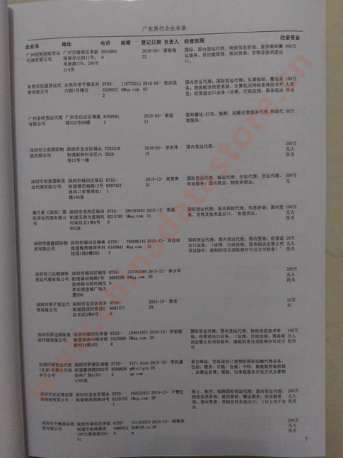 廣東貨運公司黃頁包括:企業(yè)名稱、負責人聯(lián)系方式、企業(yè)電話、傳真、Email、經(jīng)營范圍、地址、郵編等信息。