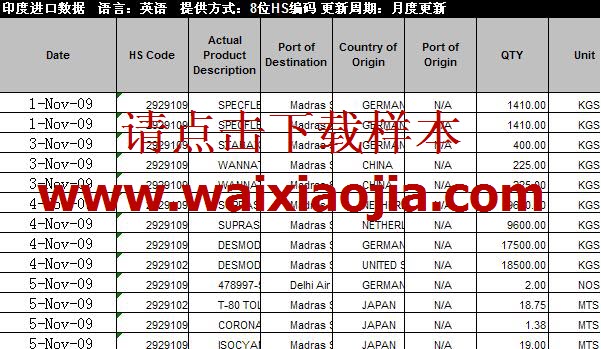 印度進(jìn)口海關(guān)數(shù)據(jù)主要產(chǎn)品內(nèi)容包括: 進(jìn)口商公司名稱、進(jìn)口單價(jià)、進(jìn)口總價(jià)、 H.S 編碼、產(chǎn)品描述、進(jìn)口日期、進(jìn)口數(shù)量、數(shù)量單位、原產(chǎn)國、運(yùn)輸方式。