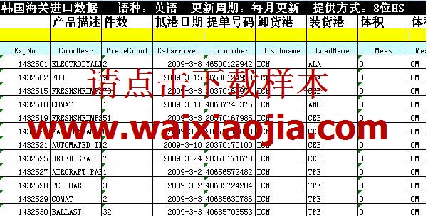 韓國(guó)海關(guān)進(jìn)出口數(shù)據(jù)(KRCD)共有10個(gè)字段(10列,EXCEL格式),含韓國(guó)進(jìn)口商(出口商)當(dāng)月產(chǎn)品進(jìn)口(出口)貿(mào)易額排序,及其聯(lián)系方式等