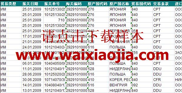 俄羅斯海關(guān)進(jìn)出口數(shù)據(jù)包含運(yùn)輸信息: 報(bào)關(guān)單號(hào)、進(jìn)出口類型、通關(guān)方式、離岸國(guó)、原產(chǎn)國(guó)名稱、目的國(guó)代碼、交易條款、交貨地、匯率、合同貨幣、交易性質(zhì)、發(fā)貨日期、交易行名稱、抵達(dá)日期、貨物信息: 海關(guān)編碼、產(chǎn)品描述、生產(chǎn)廠家名稱、商標(biāo) \ 原產(chǎn)地、商品包裝類型及嘜頭、包裝件數(shù) 毛重 / 公斤、凈重 / 公斤、貨物發(fā)票值、貨物海關(guān)值