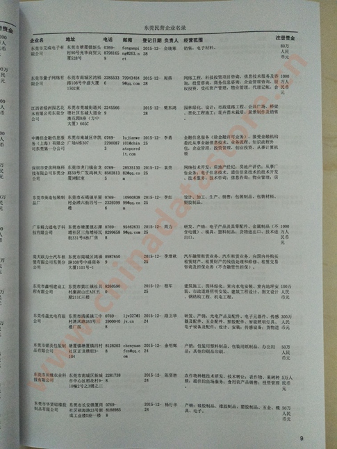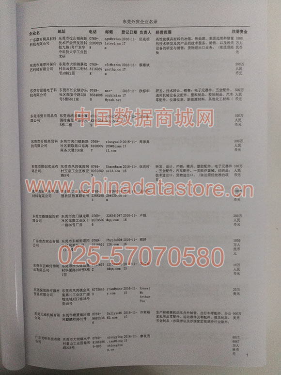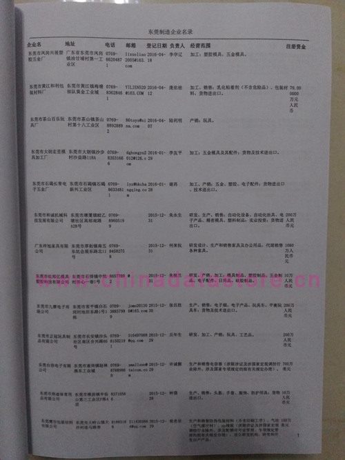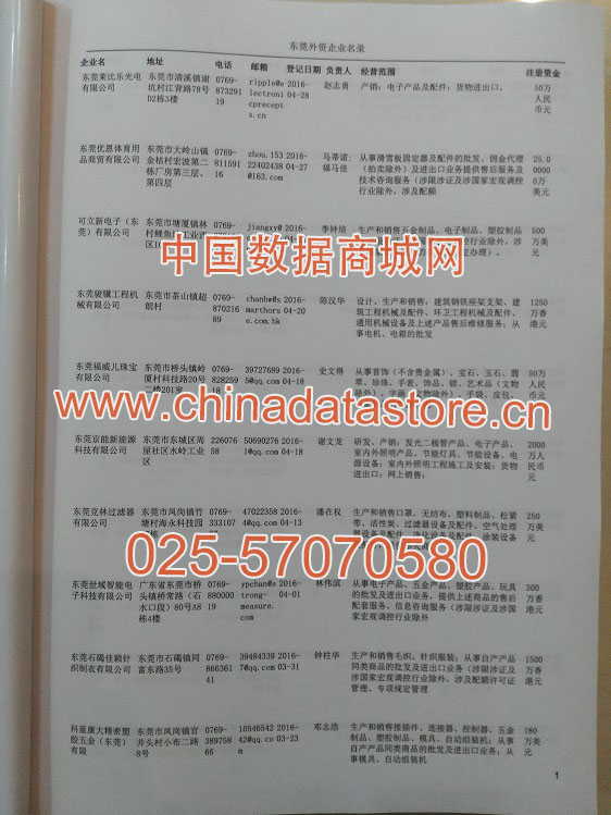 2021版最新東莞企業(yè)黃頁包括《東莞制造企業(yè)黃頁》、《東莞貿(mào)易企業(yè)黃頁》、《東莞民營企業(yè)黃頁》、《東莞外資企業(yè)黃頁》、《東莞外貿(mào)企業(yè)黃頁》共五冊,現(xiàn)優(yōu)惠價:280元/冊。每冊內(nèi)容包括:單位名稱、地址、郵編、電話、傳真、郵箱、經(jīng)營范圍等;東莞企業(yè)黃頁涵蓋了近幾年來最新成立的、有一定規(guī)模的企業(yè),具有非常高的營銷價值。有了這套黃頁開展業(yè)務也有了針對性,也省去了盲目去尋找客戶名單而浪費的時間了,工作效率也會有很大的提高。歡迎需要東莞企業(yè)黃頁的朋友及時聯(lián)系我們!