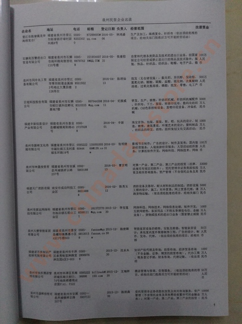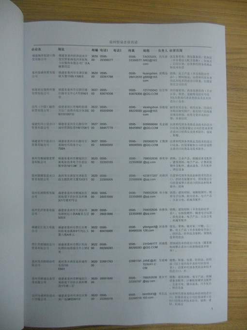 2021版最新泉州企業(yè)黃頁(yè)包括《泉州制造企業(yè)黃頁(yè)》、《泉州貿(mào)易企業(yè)黃頁(yè)》、《泉州民營(yíng)企業(yè)黃頁(yè)》、《泉州外資企業(yè)黃頁(yè)》、《泉州外貿(mào)企業(yè)黃頁(yè)》共五冊(cè),現(xiàn)優(yōu)惠價(jià):280元/冊(cè)。每?jī)?cè)內(nèi)容包括:?jiǎn)挝幻Q(chēng)、地址、郵編、電話、傳真、郵箱、經(jīng)營(yíng)范圍等;泉州企業(yè)黃頁(yè)涵蓋了近幾年來(lái)最新成立的、有一定規(guī)模的企業(yè),具有非常高的營(yíng)銷(xiāo)價(jià)值。有了這套黃頁(yè)開(kāi)展業(yè)務(wù)也有了針對(duì)性,也省去了盲目去尋找客戶名單而浪費(fèi)的時(shí)間了,工作效率也會(huì)有很大的提高。歡迎需要泉州企業(yè)黃頁(yè)的朋友及時(shí)聯(lián)系我們!