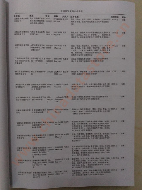 2025年新版中國珠寶采購企業(yè)黃頁,收錄了全國各地經(jīng)營范圍涉及珠寶產(chǎn)品的貿(mào)易企業(yè),這些都是頗具實力的珠寶產(chǎn)品的中國采購商。黃頁內(nèi)容包含:企業(yè)名稱、地址、電話、傳真、郵箱、經(jīng)營范圍、省份、注冊資金等信息。該套黃頁包含一個黃頁光碟加一冊紙質(zhì)書刊,全國價格:1500元,省/直轄市價格:400元,城市價格:200元,共收錄了全國各地大概44763(統(tǒng)計日期:2018.1)家珠寶產(chǎn)品采購企業(yè)。黃頁光碟中是EXCEL格式,信息可任意修改、復制、打印、導出及導入到傳真、郵件群發(fā)等軟件中,無任何限制。