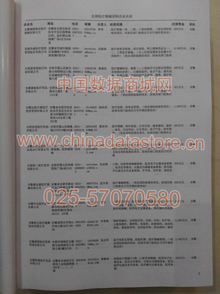 2025年新版中國(guó)醫(yī)療器械采購(gòu)企業(yè)黃頁(yè),收錄了全國(guó)各地經(jīng)營(yíng)范圍涉及醫(yī)療器械產(chǎn)品的貿(mào)易企業(yè),這些都是頗具實(shí)力的醫(yī)療器械產(chǎn)品的中國(guó)采購(gòu)商。黃頁(yè)內(nèi)容包含:企業(yè)名稱、地址、電話、傳真、郵箱、經(jīng)營(yíng)范圍、省份、注冊(cè)資金等信息。該套黃頁(yè)包含一個(gè)黃頁(yè)光碟加一冊(cè)紙質(zhì)書(shū)刊,全國(guó)價(jià)格:1200元,省/直轄市價(jià)格是:400元,城市價(jià)格是:200元,共收錄了全國(guó)各地大概36680(更新日期:2017.1)家醫(yī)療器械產(chǎn)品采購(gòu)企業(yè)。黃頁(yè)光碟中是EXCEL格式,信息可任意修改、復(fù)制、打印、導(dǎo)出及導(dǎo)入到傳真、郵件群發(fā)等軟件中,無(wú)任何限制。