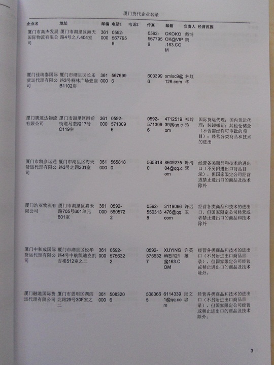 廈門貨運(yùn)公司黃頁包括:企業(yè)名稱、負(fù)責(zé)人聯(lián)系方式、企業(yè)電話、傳真、Email、經(jīng)營范圍、地址、郵編等信息。