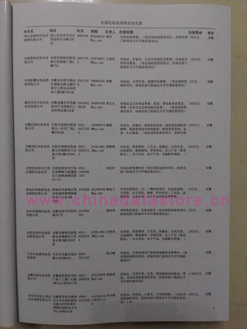 2025年新版中國(guó)化妝品采購(gòu)企業(yè)黃頁(yè),收錄了全國(guó)各地經(jīng)營(yíng)范圍涉及化妝品產(chǎn)品的貿(mào)易企業(yè),這些都是頗具實(shí)力的化妝品產(chǎn)品的中國(guó)采購(gòu)商。黃頁(yè)內(nèi)容包含:企業(yè)名稱、地址、電話、傳真、郵箱、經(jīng)營(yíng)范圍、省份、注冊(cè)資金等信息。該套黃頁(yè)包含一個(gè)黃頁(yè)光碟加一冊(cè)紙質(zhì)書(shū)刊,全國(guó)價(jià)格:1500元,省/直轄市價(jià)格:400元,城市價(jià)格:200元,共收錄了全國(guó)各地大概28010(統(tǒng)計(jì)日期:2018.1)家化妝品產(chǎn)品采購(gòu)企業(yè)。黃頁(yè)光碟中是EXCEL格式,信息可任意修改、復(fù)制、打印、導(dǎo)出及導(dǎo)入到傳真、郵件群發(fā)等軟件中,無(wú)任何限制。