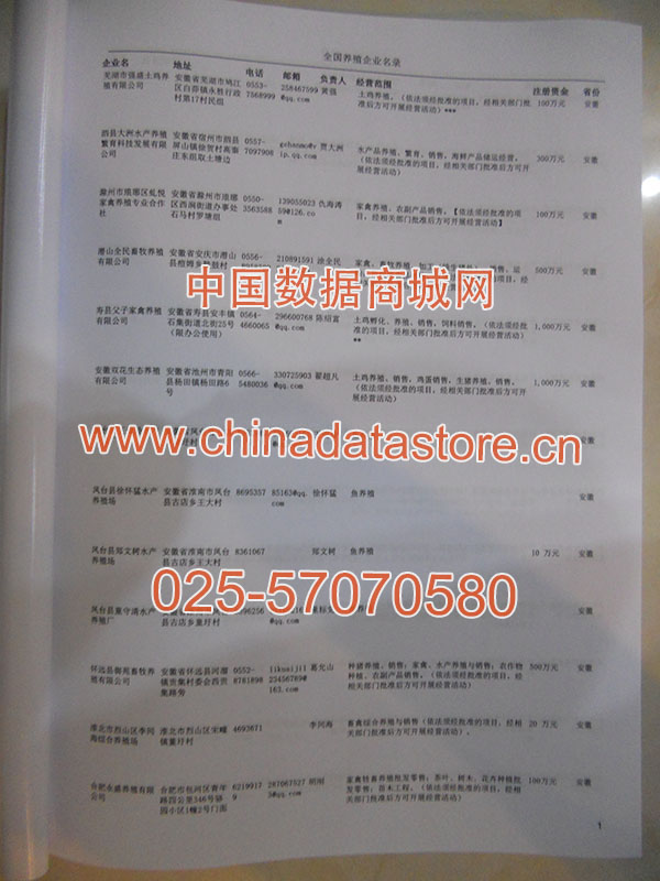 | 某省或直轄市 | 如上海、浙江養(yǎng)殖企業(yè)名單 | 80% - 90% | 600元 | 附贈(zèng)一冊(cè)養(yǎng)殖紙質(zhì)印刷品 |