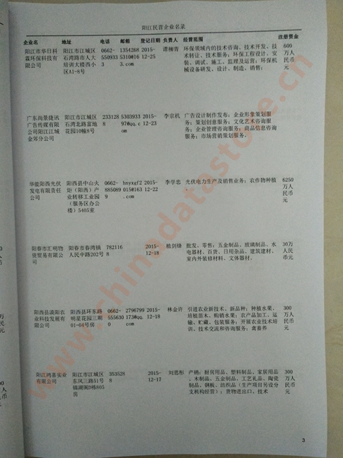 2021版最新陽(yáng)江企業(yè)黃頁(yè)包括《陽(yáng)江制造企業(yè)黃頁(yè)》、《陽(yáng)江民營(yíng)企業(yè)黃頁(yè)》,現(xiàn)優(yōu)惠價(jià):280元/冊(cè)。每?jī)?cè)內(nèi)容包括:?jiǎn)挝幻Q、地址、郵編、電話、傳真、郵箱、經(jīng)營(yíng)范圍等;陽(yáng)江企業(yè)黃頁(yè)涵蓋了近幾年來(lái)最新成立的、有一定規(guī)模的企業(yè),具有非常高的營(yíng)銷(xiāo)價(jià)值。有了這套黃頁(yè)開(kāi)展業(yè)務(wù)也有了針對(duì)性,也省去了盲目去尋找客戶名單而浪費(fèi)的時(shí)間了,工作效率也會(huì)有很大的提高。歡迎需要陽(yáng)江企業(yè)黃頁(yè)的朋友及時(shí)聯(lián)系我們!