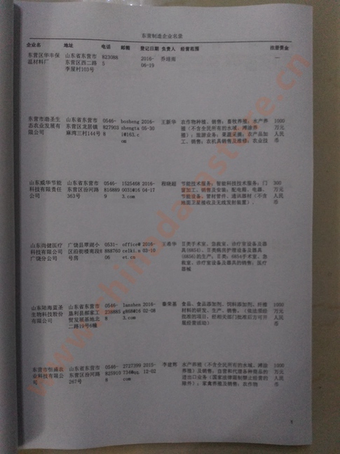2021版最新東營企業(yè)黃頁包括《東營制造企業(yè)黃頁》、《東營民營企業(yè)黃頁》,現(xiàn)優(yōu)惠價:280元/冊。每冊內(nèi)容包括:單位名稱、地址、郵編、電話、傳真、郵箱、經(jīng)營范圍等;東營企業(yè)黃頁涵蓋了近幾年來最新成立的、有一定規(guī)模的企業(yè),具有非常高的營銷價值。有了這套黃頁開展業(yè)務(wù)也有了針對性,也省去了盲目去尋找客戶名單而浪費(fèi)的時間了,工作效率也會有很大的提高。歡迎需要東營企業(yè)黃頁的朋友及時聯(lián)系我們!