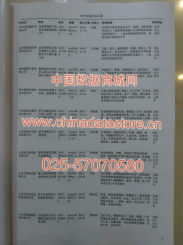 2021版最新濟(jì)寧企業(yè)黃頁包括《濟(jì)寧制造企業(yè)黃頁》、《濟(jì)寧民營企業(yè)黃頁》,現(xiàn)優(yōu)惠價:280元/冊。每冊內(nèi)容包括:單位名稱、地址、郵編、電話、傳真、郵箱、經(jīng)營范圍等;濟(jì)寧企業(yè)黃頁涵蓋了近幾年來最新成立的、有一定規(guī)模的企業(yè),具有非常高的營銷價值。有了這套黃頁開展業(yè)務(wù)也有了針對性,也省去了盲目去尋找客戶名單而浪費(fèi)的時間了,工作效率也會有很大的提高。歡迎需要濟(jì)寧企業(yè)黃頁的朋友及時聯(lián)系我們!