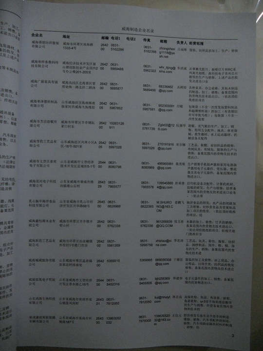 2021版最新威海企業(yè)黃頁包括《威海制造企業(yè)黃頁》、《威海民營企業(yè)黃頁》,現(xiàn)優(yōu)惠價:280元/冊。每冊內(nèi)容包括:單位名稱、地址、郵編、電話、傳真、郵箱、經(jīng)營范圍等;威海企業(yè)黃頁涵蓋了近幾年來最新成立的、有一定規(guī)模的企業(yè),具有非常高的營銷價值。有了這套黃頁開展業(yè)務(wù)也有了針對性,也省去了盲目去尋找客戶名單而浪費的時間了,工作效率也會有很大的提高。歡迎需要威海企業(yè)黃頁的朋友及時聯(lián)系我們!