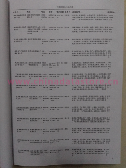 最新江蘇紡織生產與貿易企業(yè)黃頁數(shù)據(jù)更新日期2025年12月最新,全國江蘇紡織企業(yè)黃頁,都是具有一定規(guī)模的江蘇紡織行業(yè)的注冊實體企業(yè),數(shù)據(jù)準確率高,是您開展各項營銷活動的必備資料。企業(yè)名單包括:企業(yè)名稱、地址、電話(以上必有,以下選有)、傳真、郵箱、登記日期、經(jīng)營范圍、注冊資金等信息。江蘇紡織企業(yè)黃頁數(shù)據(jù)為Excel格式,信息可任意修改、復制、打印、導出及導入到傳真、郵件群發(fā)等軟件中,無任何限制。