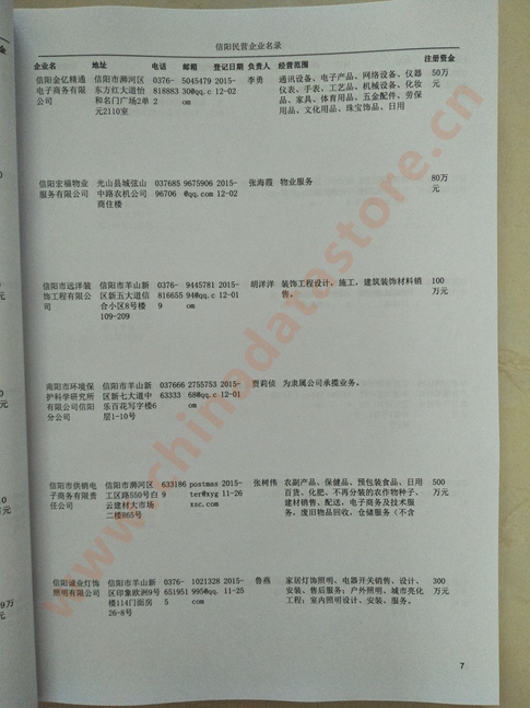 2021版最新信陽企業(yè)黃頁包括《信陽制造企業(yè)黃頁》、《信陽民營企業(yè)黃頁》,現(xiàn)優(yōu)惠價(jià):280元/冊。每冊內(nèi)容包括:單位名稱、地址、郵編、電話、傳真、郵箱、經(jīng)營范圍等;信陽企業(yè)黃頁涵蓋了近幾年來最新成立的、有一定規(guī)模的企業(yè),具有非常高的營銷價(jià)值。有了這套黃頁開展業(yè)務(wù)也有了針對性,也省去了盲目去尋找客戶名單而浪費(fèi)的時(shí)間了,工作效率也會(huì)有很大的提高。歡迎需要信陽企業(yè)黃頁的朋友及時(shí)聯(lián)系我們!