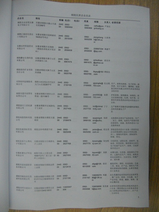 2021版最新銅陵企業(yè)黃頁包括《銅陵制造企業(yè)黃頁》、《銅陵民營企業(yè)黃頁》,現(xiàn)優(yōu)惠價(jià):280元/冊。每冊內(nèi)容包括:單位名稱、地址、郵編、電話、傳真、郵箱、經(jīng)營范圍等;銅陵企業(yè)黃頁涵蓋了近幾年來最新成立的、有一定規(guī)模的企業(yè),具有非常高的營銷價(jià)值。有了這套黃頁開展業(yè)務(wù)也有了針對性,也省去了盲目去尋找客戶名單而浪費(fèi)的時(shí)間了,工作效率也會有很大的提高。歡迎需要銅陵企業(yè)黃頁的朋友及時(shí)聯(lián)系我們!