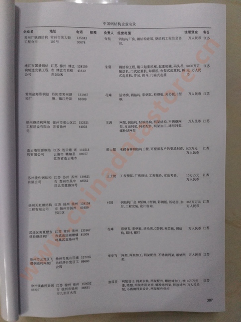 最新鋼結(jié)構(gòu)生產(chǎn)與貿(mào)易企業(yè)黃頁數(shù)據(jù)更新日期2025年12月最新,全國鋼結(jié)構(gòu)企業(yè)名單共12000條,都是具有一定規(guī)模的鋼結(jié)構(gòu)行業(yè)的注冊實(shí)體企業(yè),數(shù)據(jù)準(zhǔn)確率高,是您開展各項(xiàng)營銷活動(dòng)的必備資料。鋼結(jié)構(gòu)企業(yè)黃頁包括:企業(yè)名稱、地址、電話、傳真、郵箱、登記日期、經(jīng)營范圍、注冊資金等信息。鋼結(jié)構(gòu)企業(yè)名單數(shù)據(jù)為Excel格式,信息可任意修改、復(fù)制、打印、導(dǎo)出及導(dǎo)入到傳真、郵件群發(fā)等鋼結(jié)構(gòu)中,無任何限制。