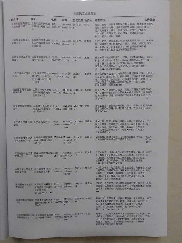2021版最新太原企業(yè)黃頁包括《太原制造企業(yè)黃頁》、《太原民營企業(yè)黃頁》,現(xiàn)優(yōu)惠價:280元/冊。每冊內(nèi)容包括:單位名稱、地址、郵編、電話、傳真、郵箱、經(jīng)營范圍等;太原企業(yè)黃頁涵蓋了近幾年來最新成立的、有一定規(guī)模的企業(yè),具有非常高的營銷價值。有了這套黃頁開展業(yè)務(wù)也有了針對性,也省去了盲目去尋找客戶名單而浪費(fèi)的時間了,工作效率也會有很大的提高。歡迎需要太原企業(yè)黃頁的朋友及時聯(lián)系我們!
