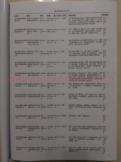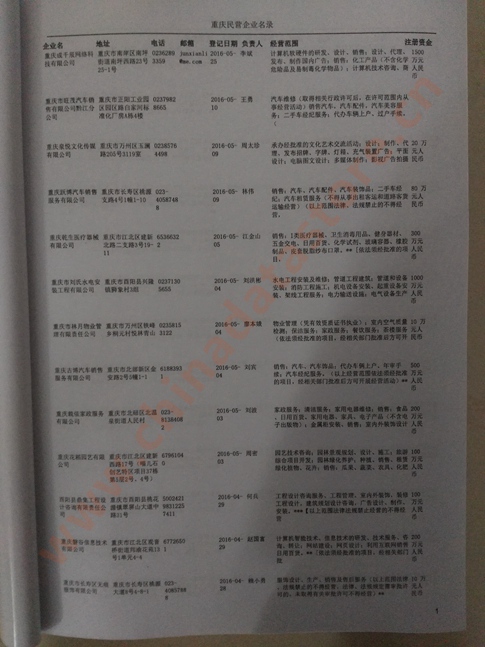 2021版最新重慶企業(yè)黃頁包括《重慶制造企業(yè)黃頁》、《重慶民營(yíng)企業(yè)黃頁》,現(xiàn)優(yōu)惠價(jià):280元/冊(cè)。每?jī)?cè)內(nèi)容包括:?jiǎn)挝幻Q、地址、郵編、電話、傳真、郵箱、經(jīng)營(yíng)范圍等;重慶企業(yè)黃頁涵蓋了近幾年來最新成立的、有一定規(guī)模的企業(yè),具有非常高的營(yíng)銷價(jià)值。有了這套黃頁開展業(yè)務(wù)也有了針對(duì)性,也省去了盲目去尋找客戶名單而浪費(fèi)的時(shí)間了,工作效率也會(huì)有很大的提高。歡迎需要重慶企業(yè)黃頁的朋友及時(shí)聯(lián)系我們!