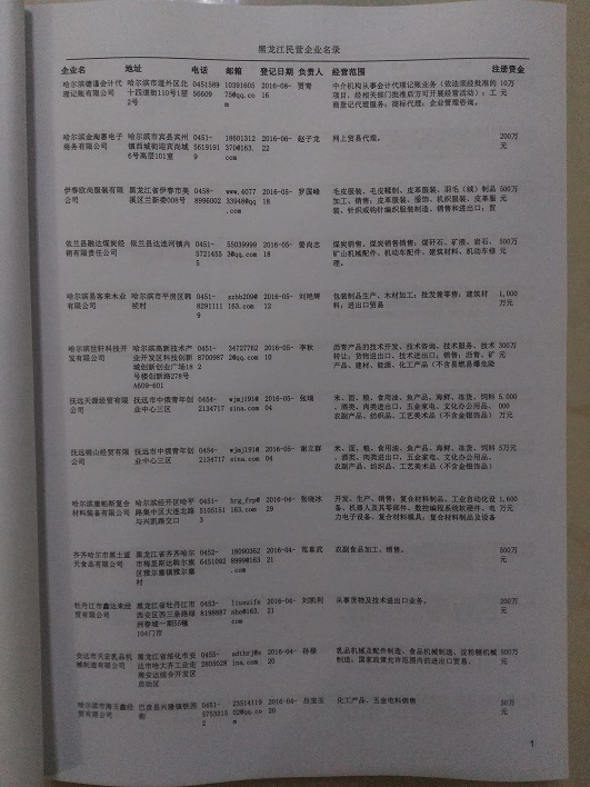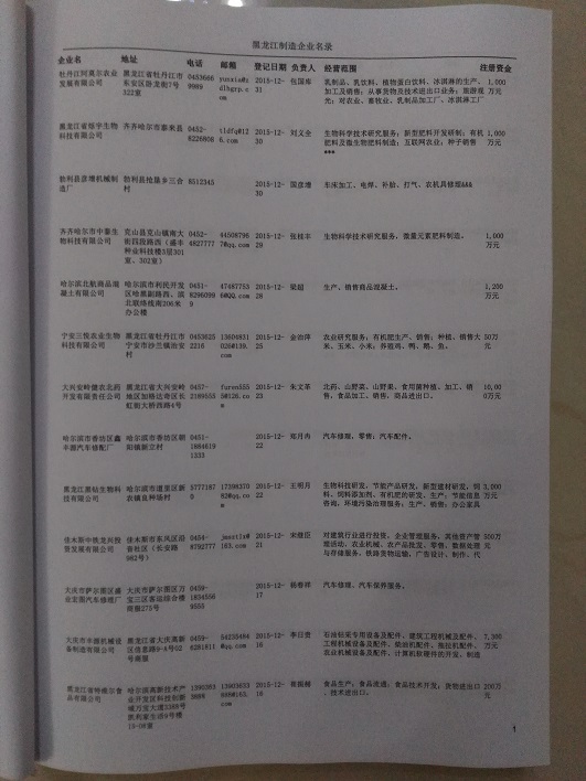 2021版最新黑龍江企業(yè)黃頁(yè)包括《黑龍江制造企業(yè)黃頁(yè)》、《黑龍江貿(mào)易企業(yè)黃頁(yè)》、《黑龍江民營(yíng)企業(yè)黃頁(yè)》共三冊(cè),優(yōu)惠價(jià):280元/冊(cè)。每?jī)?cè)內(nèi)容包括:?jiǎn)挝幻Q、地址、郵編、電話、傳真、郵箱、經(jīng)營(yíng)范圍等;黑龍江企業(yè)黃頁(yè)涵蓋了近幾年來(lái)最新成立的、有一定規(guī)模的企業(yè),具有非常高的營(yíng)銷價(jià)值。有了這套黃頁(yè)開(kāi)展業(yè)務(wù)也有了針對(duì)性,也省去了盲目去尋找客戶名單而浪費(fèi)的時(shí)間了,工作效率也會(huì)有很大的提高。歡迎需要黑龍江企業(yè)黃頁(yè)的朋友及時(shí)聯(lián)系我們!
