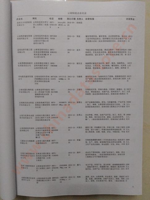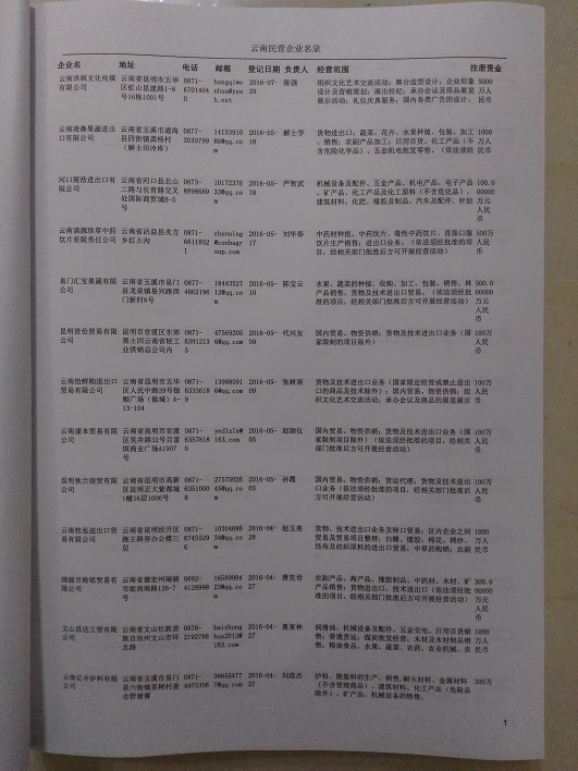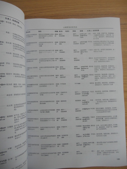 2021版最新云南企業(yè)黃頁包括《云南制造企業(yè)黃頁》、《云南貿(mào)易企業(yè)黃頁》、《云南民營企業(yè)黃頁》共三冊,優(yōu)惠價(jià):280元/冊。每冊內(nèi)容包括:單位名稱、地址、郵編、電話、傳真、郵箱、經(jīng)營范圍等;云南企業(yè)黃頁涵蓋了近幾年來最新成立的、有一定規(guī)模的企業(yè),具有非常高的營銷價(jià)值。有了這套黃頁開展業(yè)務(wù)也有了針對性,也省去了盲目去尋找客戶名單而浪費(fèi)的時(shí)間了,工作效率也會(huì)有很大的提高。歡迎需要云南企業(yè)黃頁的朋友及時(shí)聯(lián)系我們!