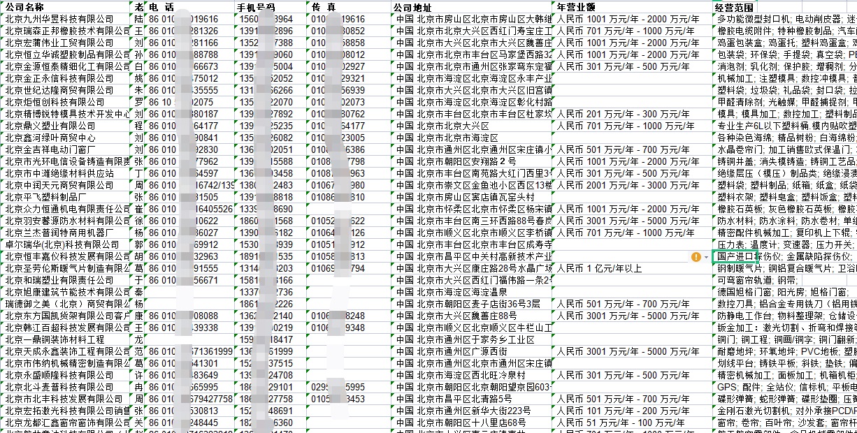 數(shù)據(jù)介紹:阿里巴巴全國企業(yè)數(shù)據(jù),本次共采集數(shù)據(jù)超過400萬條。 詳細(xì)字段說明: “公司名稱”,”電話”,”老板姓名”,”手機(jī)”,”傳真”,”經(jīng)營范圍”,”公司地址”,”年營業(yè)額”。