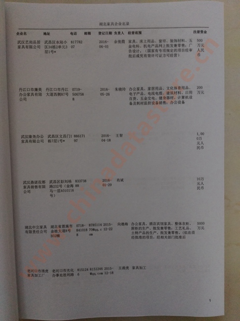 最新湖北家具生產(chǎn)與貿(mào)易企業(yè)黃頁數(shù)據(jù)更新日期2025年12月最新,湖北家具企業(yè)黃頁,都是具有一定規(guī)模的湖北家具行業(yè)的注冊實(shí)體企業(yè),數(shù)據(jù)準(zhǔn)確率高,是您開展各項(xiàng)營銷活動的必備資料。企業(yè)名單包括:企業(yè)名稱、地址、電話(以上必有,以下選有)、傳真、郵箱、登記日期、經(jīng)營范圍、注冊資金等信息。湖北家具企業(yè)黃頁數(shù)據(jù)為Excel格式,信息可任意修改、復(fù)制、打印、導(dǎo)出及導(dǎo)入到傳真、郵件群發(fā)等軟件中,無任何限制。