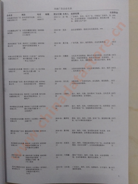 最新河南廣告生產(chǎn)與貿(mào)易企業(yè)黃頁數(shù)據(jù)更新日期2025年12月最新,河南廣告企業(yè)黃頁,都是具有一定規(guī)模的河南廣告行業(yè)的注冊實(shí)體企業(yè),數(shù)據(jù)準(zhǔn)確率高,是您開展各項(xiàng)營銷活動的必備資料。企業(yè)名單包括:企業(yè)名稱、地址、電話(以上必有,以下選有)、傳真、郵箱、登記日期、經(jīng)營范圍、注冊資金等信息。河南廣告企業(yè)黃頁數(shù)據(jù)為Excel格式,信息可任意修改、復(fù)制、打印、導(dǎo)出及導(dǎo)入到傳真、郵件群發(fā)等軟件中,無任何限制。