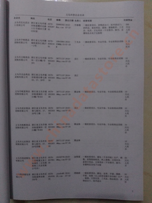 義烏外貿(mào)企業(yè)黃頁包括:外貿(mào)企業(yè)名稱、地址、電話、傳真、郵箱、經(jīng)營范圍、注冊(cè)資金等信息。