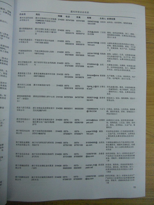 嘉興外貿(mào)企業(yè)黃頁包括:外貿(mào)企業(yè)名稱、地址、電話、傳真、郵箱、經(jīng)營范圍、注冊(cè)資金等信息。