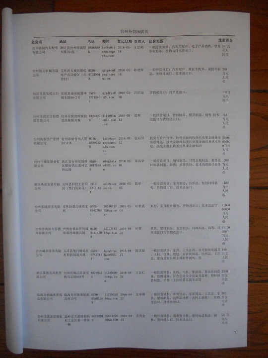 臺(tái)州外貿(mào)企業(yè)黃頁(yè)包括:外貿(mào)企業(yè)名稱(chēng)、地址、電話、傳真、郵箱、經(jīng)營(yíng)范圍、注冊(cè)資金等信息。