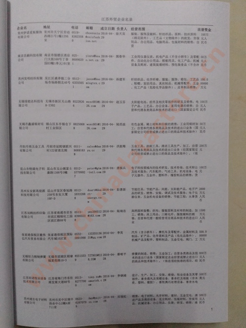 江蘇外貿(mào)企業(yè)黃頁包括:外貿(mào)企業(yè)名稱、地址、電話、傳真、郵箱、經(jīng)營范圍、注冊(cè)資金等信息。