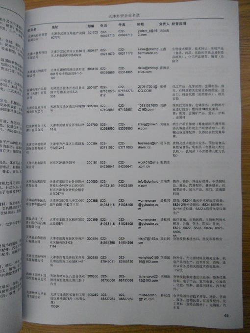 天津外貿(mào)企業(yè)黃頁包括:外貿(mào)企業(yè)名稱、地址、電話、傳真、郵箱、經(jīng)營(yíng)范圍、注冊(cè)資金等信息。
