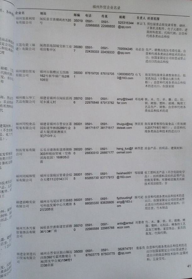 福州外貿(mào)企業(yè)黃頁(yè)包括:外貿(mào)企業(yè)名稱、地址、電話、傳真、郵箱、經(jīng)營(yíng)范圍、注冊(cè)資金等信息。