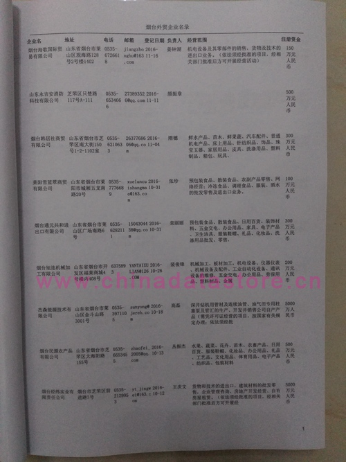煙臺外貿(mào)企業(yè)黃頁包括:外貿(mào)企業(yè)名稱、地址、電話、傳真、郵箱、經(jīng)營范圍、注冊資金等信息。