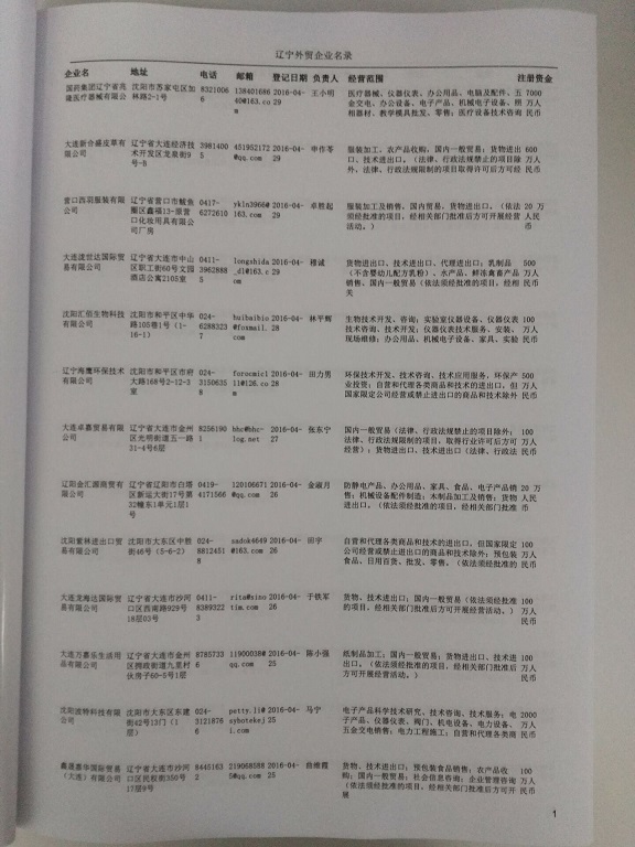 遼寧外貿(mào)企業(yè)黃頁(yè)包括:外貿(mào)企業(yè)名稱、地址、電話、傳真、郵箱、經(jīng)營(yíng)范圍、注冊(cè)資金等信息。