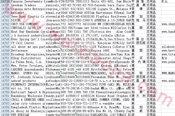 日用品采購商名單數(shù)據(jù)為Excel格式,信息可任意修改、復(fù)制、打印、導(dǎo)出及導(dǎo)入到傳真、郵件群發(fā)等軟件中,無任何限制。